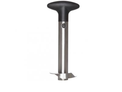 Snijd de top en bodem van de ananas recht af. Zet de ananas rechtop en duw de ananassnijder met een draaibeweging in de kern van de ananas. Draai aan de snijder tot de onderkant bereikt is. Trek de snijder daarna voorzichtig uit de schil. Rond de staaf van de ananassnijder bevindt zich het in een spiraal gesneden vruchtvlees zonder kern.ANANASSNIJDER RVS