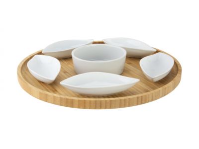 Cosy & Trendy Serveerplank D26xh3cm Rond Bamboe+6 Keramieken Bowls (11.5x5x25cm)