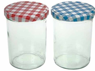 KITCHEN >> Inmaakglazen en -bokalen >> Cosy & Trendy >> Confituurpot Set3 Transparant 44cl 8,5cm Deksels: 3x Blauw-wit Of 3x Rood-wit