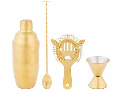 TABLE >> Baraccessoire >> Cosy & Trendy >> Cocktailset 4pcs Pvd Gold Met Shaker – Barmaatje - Zeef – Cocktaillepel