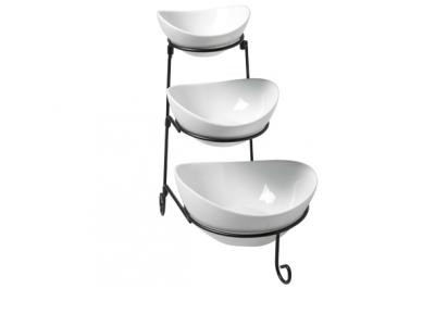 Deze buffet-etagère op sierlijke standaard is voorzien van drie glanzende porseleinen schaaltjes. Ze leent zich uitstekend voor een ontbijtbuffet: u kunt de schaaltjes vullen met cornflakes, muesli ... Bovendien wordt de etagère ook gebruikt bij koude buffetten om vleessalade, rijst en aardappelsalade te presenteren.