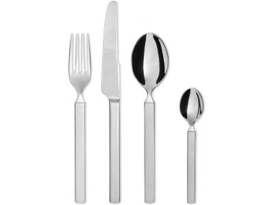 Bestekset bestaande uit een eetlepel, een tafelvork, een tafelmes, een koffielepel in 18/10 hoogglans gepolijst roestvrij staal met mat handvat.