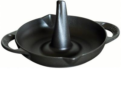 De gietijzeren roaster met grote centrale punt gaart de kip of ander gevogelte van binnen uit. uw garantie op een heerlijk en sappig resultaat