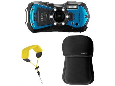 Deze Pentax WG-90 kit wordt geleverd met een Neopreen tas en een drijfriem voor om je pols.
