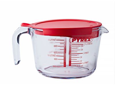 Maatbeker in borosilicaatglas met goed afsluitend plastic deksel voor het veilig en luchtdicht bewaren van vloeibare bereidingen. Ideaal om beslag op voorhand te bereiden en kliekjes in de koelkast te bewaren. Draai het gietdeksel eenvoudig op de gewenste doorstroomopening en sluit opnieuw af na gebruik. De geperforeerde gietopening filtert ongewenste of gestolde ingrediënten uit je bereiding. Uitgerust met rode Pyrex schaalindeling.