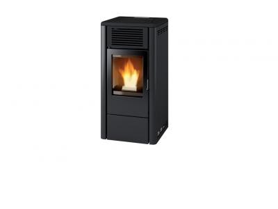 Pelletkachel GIO 8 Kw. Zijpanelen staal: zwart, wit, aluminium of bordeaux. Optie: basic afstandsbediening tegen meerprijs.