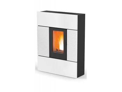 Verplaatsbare pelletkachel met beperkte diepte (28,6 cm). Het is verkrijgbaar met steen of keramiek front in wit, bordeaux, zwart. Het heeft twee luchtuitlaten, één op het deksel, voor de kamer waar het is geïnstalleerd en het andere kan worden afgevoerd om andere kamers te verwarmen, tot een afstand van 8 meter. De rookgasafvoer kan zich aan de achterkant bevinden, zoals op de foto of hierboven, om het volume verder te verminderen.