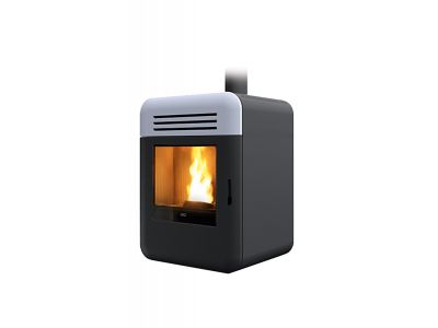 Pelletkachel let minimalistisch ontwerp; beschikt over een zwart gelakte stalen bekleding en een zwarte, witte keramische frontgrille of in speksteen. Dankzij zijn beperkte hoogte (80 cm) en zijn schouwkanaal aan de bovenzijde, kan deze kachel worden geïnstalleerd in woningen die al een rookkanaal hebben.