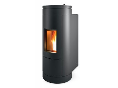 Pelletkachel met geforceerde ventilatie met gesloten structuur, ontworpen door Patricia Urquiola. De structuur is van zwart geverfd staal; de basis is in zwart staal of in hout, steen, terrazzo of beton grijze afwerking. Het werkt met Maestro-technologie. De rookafvoer kan zich aan de achterkant bevinden, zoals op de foto of hierboven (UP-versie!).