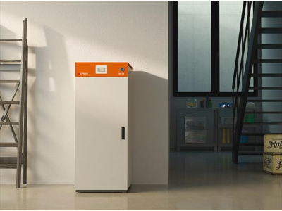 Thermo pelletketel met monoblok, ketel, vuurhaard, vuurpot, stalen transportband. Wisselaarreinigingssysteem met roterende elementen. Standaard expansievat, circulatiepomp met hoog rendement. Omkeerbare buitendeur, van staal, geïsoleerd en te openen met handgreep.