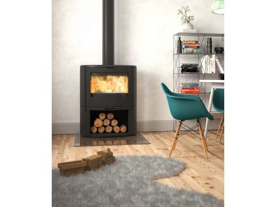 Het ovale ontwerp en de elegant gebogen gegoten deur zorgen voor een groot panoramisch uitzicht op het vuur. Er is keuze tussen 3 versies: op sokkel, op poten of op houtvak.