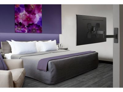 De platte draai- en kantelbare PFW 2000-serie muurbeugels is speciaal ontwikkeld voor de hospitality branche. Hierbij gaat het om het bieden van de best mogelijke service aan uw gasten. Eén van die services is in-room entertainment, waarvan gasten hoge verwachtingen hebben. Vanwege het stijlvolle en slanke ontwerp is de PFW 2000-serie ideaal om uw content te tonen. Door het meegeleverde, onopvallende slot is uw hoteltelevisie beveiligd tegen diefstal. Dankzij de slotfunctie en TÜV-certificering bent u verzekerd van een veilige en platte oplossing.