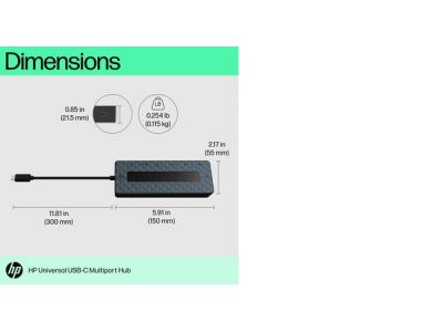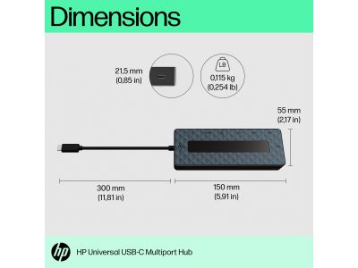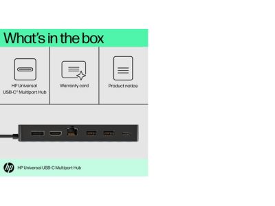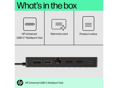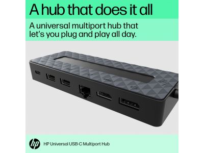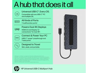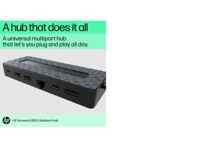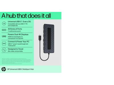 Profiteer van de nieuwe mogelijkheden met de HP Universal USB-C Multiport hub, die nu elke met USB-C®[1] compatibele pc ondersteunt. 7 poorten, 1 stroom- en datadoorvoerkabel, en veel randapparatuur om via plug-en-play aan te sluiten. Hij ondersteunt ook twee 4K-beeldschermen[2] via HDMI 2.0 en 1 DisplayPort™ 1.2. Deze hub is alles wat je nodig hebt om verbonden te blijven.