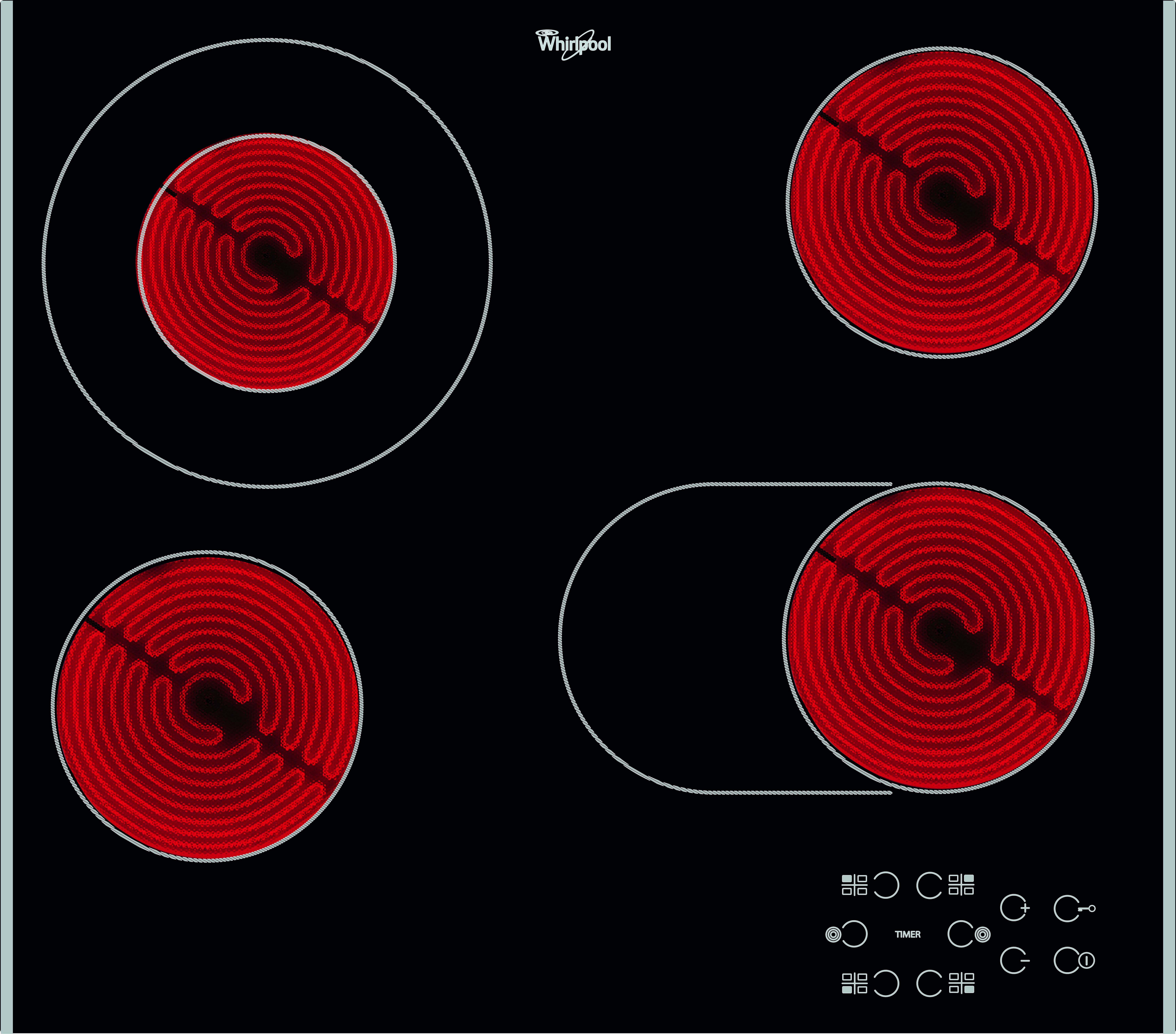 Keramische kookplaat van 58 cm. HiLight elementen: in 6 seconden op vol vermogen. Easy Touch elektronische bediening en timer voor kooktijdinstelling. Vergrendeling van het bedieningspaneel.
