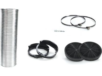 2 koolstoffilters, koolstoffilter-houder, deflector, flexibele buis ø 150 mm en 1500 mm lang, 2 klembeugels en montage-uitrusting