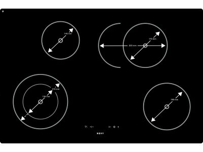Afmetingen buitenmaten: 78 x 52 x 4,1 cm. Groottes van de kookzones: 2 x 14,5 cm (1200 W), 1 x 21/13,5 cm (2200 W/1000W), 1 x 26,5/17 cm (2400 W/1500W).