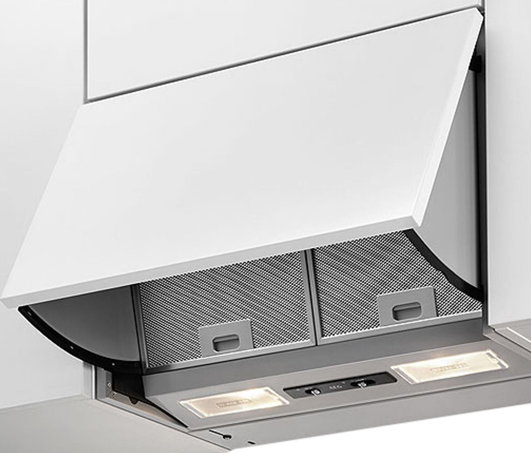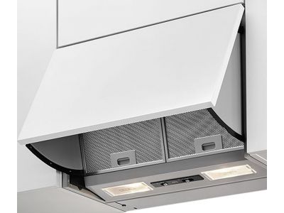 Deze discrete dampkap zit verborgen in de unit boven de kookplaat en is alleen zichtbaar als het nodig is; ze kan makkelijk opengeklapt worden om de afzuiging te activeren tijdens het koken en opnieuw dichtgeklapt worden als u klaar bent.