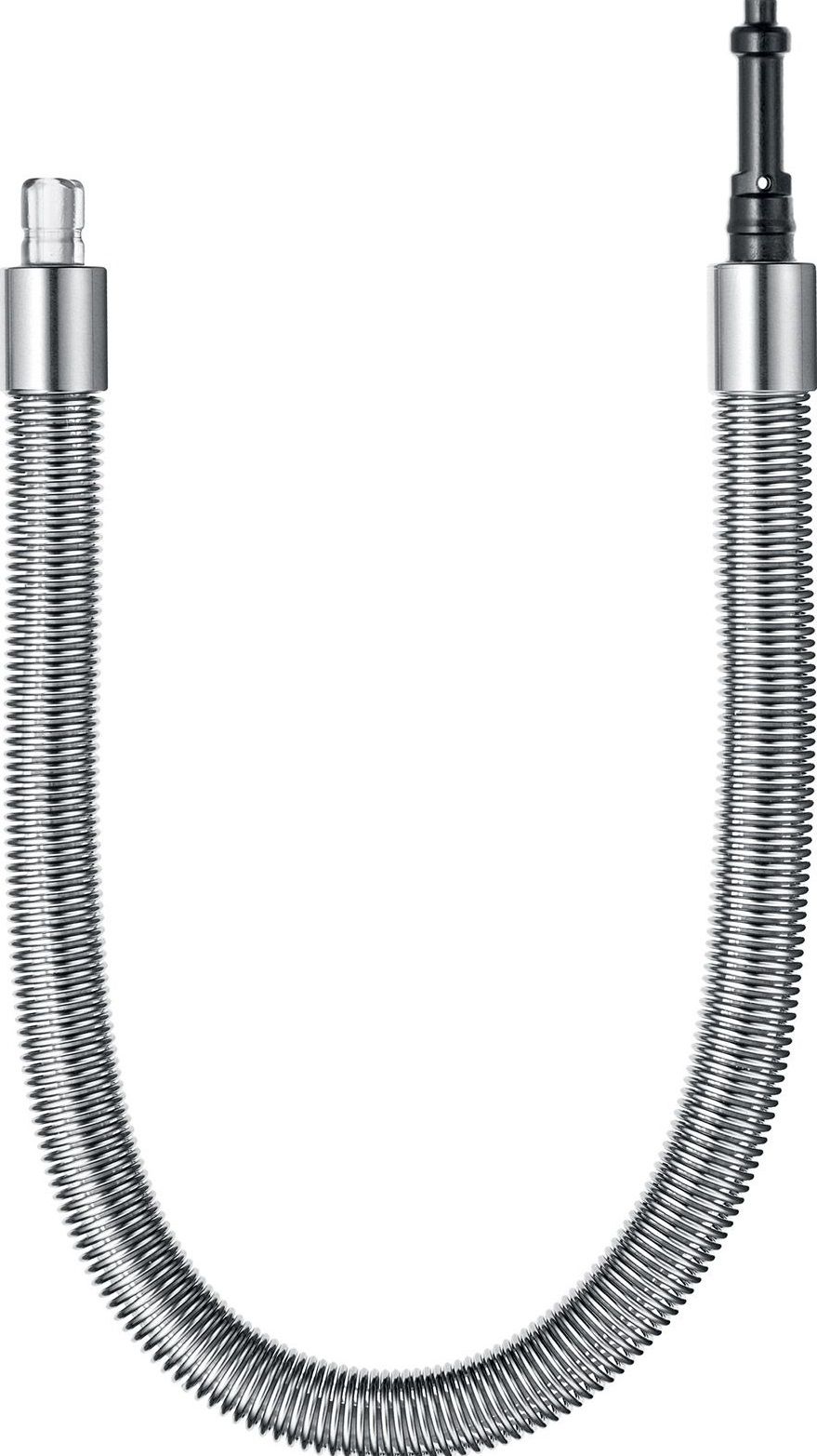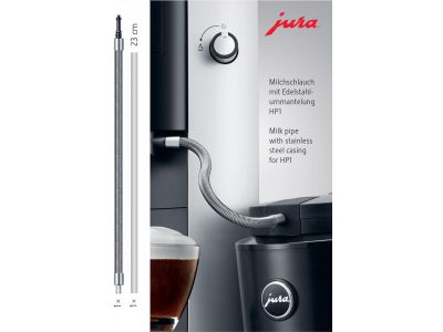 De met een hoogwaardige spiraalveer van roestvrij staal ommantelde melkslang verbindt de melkhouder met de melkuitloop, en rondt het elegante design van iedere volautomaat op sublieme wijze af. De kijkdichte ommanteling is gemaakt van hoogwaardige materialen en garandeert een uitstekende bescherming tegen UV-stralen en lichtinvloeden. De exact passende verbindingen zorgen voor luchtdichte overgangen. De direct gebruiksklare melkslang is de perfecte oplossing voor een gelijkblijvende en optimale melkhygiëne.