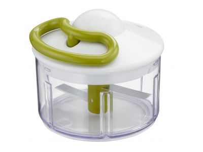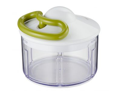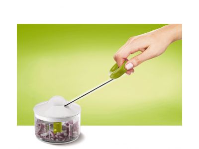 - De onafhankelijke ultra-resistente RVS messenkunnen alle soorten voedsel hakken. Je stopt het eten in grove stukken in de transparante kom waarin het accessoire met de twee messen zich bevindt. Door het treksysteem met het draad gaan de twee messen draaien. Binnen enkele seconden is het product fijn gehakt. Wanneer je het product minder fijn wilt hakken, stop je gewoon eerder.