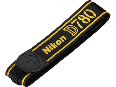 Schouderriem voor de D780, gemaakt van geweven stof waarop de cameranaam en het Nikon-logo zijn geborduurd.