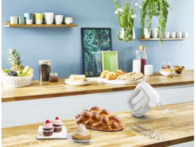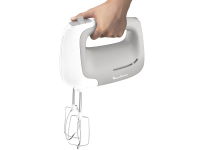 De Prep'Mix handmixer van Moulinex is ongetwijfeld de must-have partner bij het bakken! Deze compacte maarkrachtige elektrische handmixer beschikt over een motor van 450 W en vijf instelbare snelheidsstanden metturbofunctie. Het kan moeiteloos een hele reeks bereidingen aan, gaande van lichte en luchtige tot de zwaarderemengsels. Inclusief twee gardes en twee deeghaken van hoogwaardig roestvrij staal, die bovendien één voor éénvaatwassserbestendig zijn!