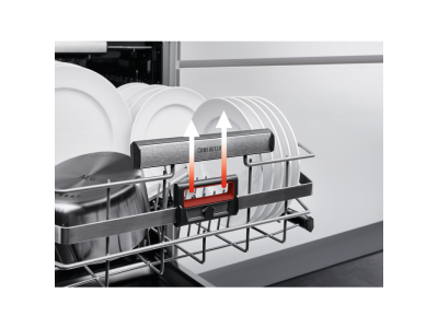 Zelfs als de bovenkorf geladen is, kan je het niveau van de bovenkorf van jouw vaatwasser eenvoudig aanpassen aan de vaat in de bovenste of onderste korf.
