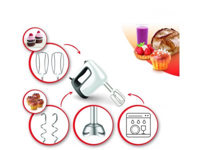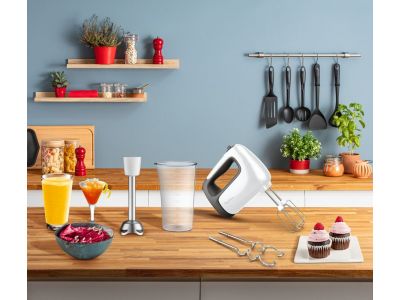 Elke dag weer feilloos en eenvoudig bakken zonder knoeien dankzij deze comfortable handmixer met stabiele rustpositie.