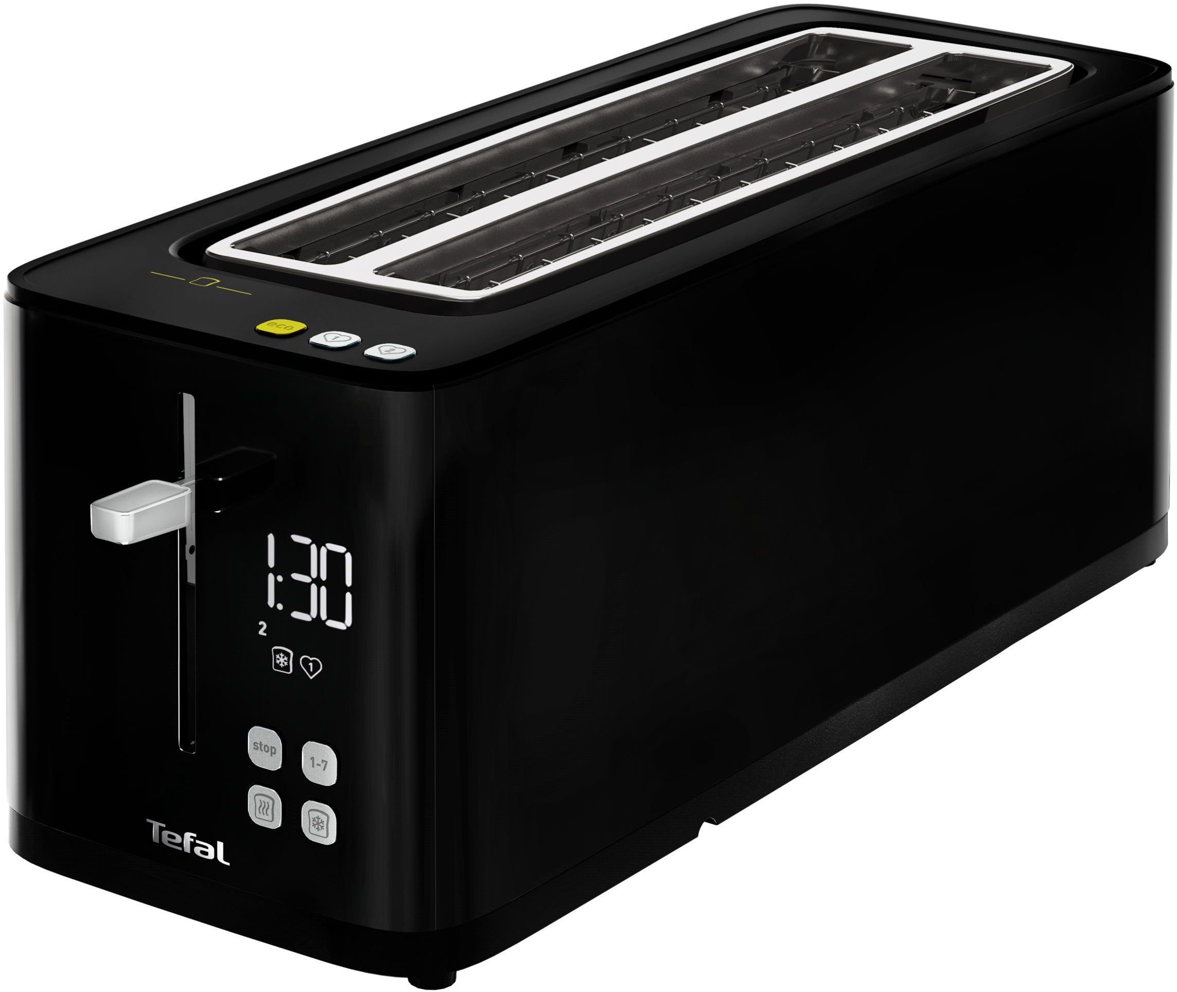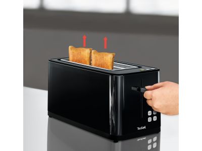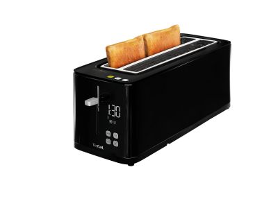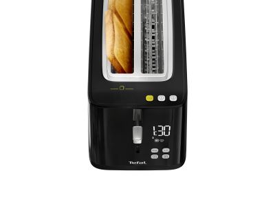 Tefal XL broodrooster met extra lange sleuven. Met één druk op de knop bepaar je tot 35% energie*. Met de Smart & Light broodrooster kan je je voorkeursinstellingen bewaren. Geniet van perfect gebruinde toast met de slimme Tefal toaster die intuïtief te gebruiken is. Dit gestroomlijnde broodrooster met twee sleuven laat je je voorkeursinstellingen opslaan, zodat ze met één druk op de knop te activeren zijn. Zo kan je altijd van toast genieten die op jouw favoriete manier bereid is. Het naadloze digitale scherm telt af tot je toast klaar is; daarnaast heeft dit broodrooster met twee sleuven ook zeven bruiningsstanden, van licht goud tot extra knapperig voor resultaten op maat. Dankzij de ecoknop gebruik je vanaf nu tot wel 35% minder energie. Verder heeft de broodrooster handige functies zoals Stop-, Ontdooiing- en Opwarmknoppen met controlelampjes, sleuven waarvan de breedte ingesteld kan worden, zodat het brood altijd precies in het midden gepositioneerd is, een uitneembare kruimellade voor eenvoudig schoonmaken en een high-lift systeem voor het eenvoudig uitnemen van geroosterd brood. Ook staat het gestroomlijnde en intuïtieve design perfect op het aanrecht van elke moderne keuken.