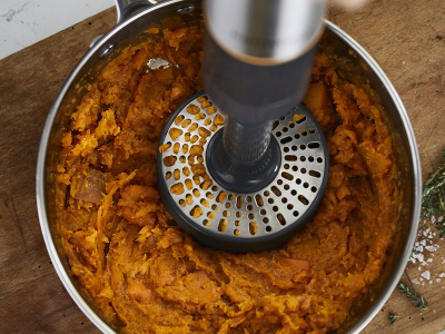 Creëer perfect luchtige aardappelpuree met de pureevoet. Je pureert tot 2x gemakkelijker dan met de hand*.