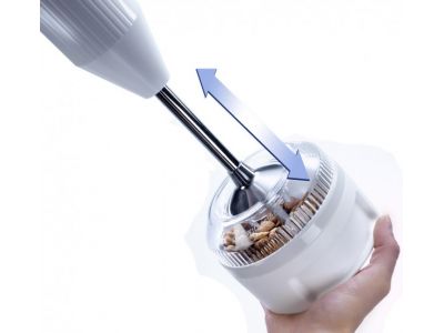 De processormolen (200ml) van Bamix is geschikt voor het fijnmalen van droge en natte ingrediënten, zoals gedroogde groenten, harde kaas, chocolade, suiker tot poedersuiker, specerijen zoals kaneel, vanille, chili, zelfs nootmuskaat. Koffie, oud brood in broodkruimels, droge vis en champignons, alle soorten noten, pinda's tot pindakaas, granen en zaden. Hakt knoflook, ui, kokos, chili, mierikswortel, allerlei culinaire kruiden, kleine hoeveelheden vlees of vis, en gekookte eieren.