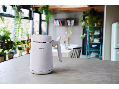 De 100% biobased plastics** zijn gemaakt van biologische en hernieuwbare bronnen, zoals zonnebloemolie. Gebruikte olie die bij het koken achterblijft, wordt verzameld en gerecycled via een milieuvriendelijk proces om deze geschikt te maken voor contact met voedsel. De waterkoker heeft een meervoudig veiligheidssysteem om te voorkomen dat deze ook zonder water werkt.