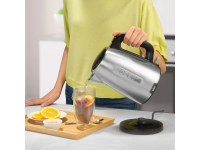 Schakelt automatisch uit wanneer de temperatuur is bereikt, wanneer de waterkoker leeg is of van de basis is verwijderd en extra stabiliteit tot een helling van 15°.