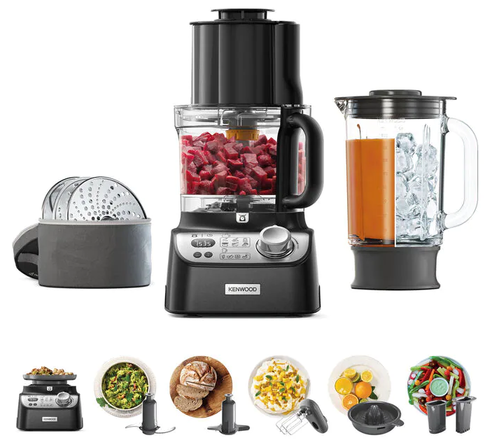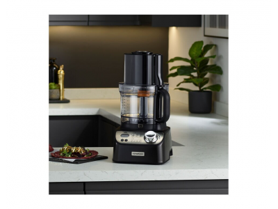 1000W, die cast metal base, 3L bowl with wide feed tube, 1,5L thermoresist glass blender, dough tool, dual metal wisk, citrus press, digital weighing and digital count up timer, dicer, ADJ SLICING DISC, reversible grating disc, extra fine grating disc, smartstore, BLACK