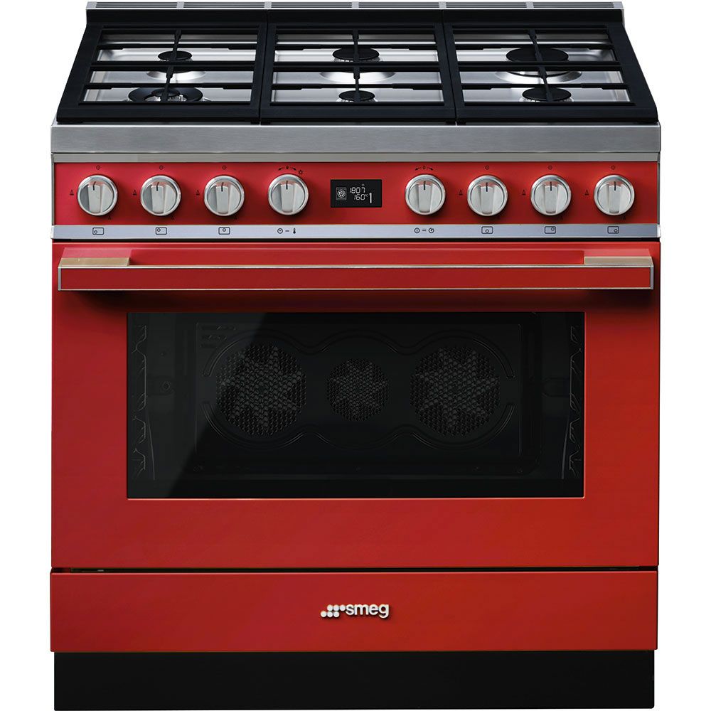 Fornuis 90 x 60 - 6 branders gas - oven multifunctie - energieklasse A+ - pyrolyse - rood