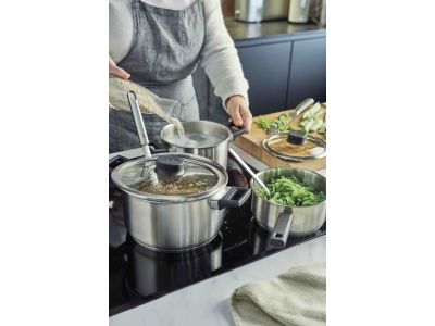 Dankzij de glazen deksels hou je moeiteloos overal tegelijk een oogje in het zeil. Hun brede roestvrijstalen rand geeft ze nog meer stevigheid. Het handige steelpannetje maakt je kookgemak compleet. De bakelieten grepen zijn perfect bevestigd en liggen prettig in de hand. Comfort 3 is praktisch en betrouwbaar.
