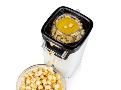 Zie direct hoe de mais omgetoverd wordt in popcorn dankzij de transparante deksel. Gebruik het maatbekertje om de juiste hoeveelheid pofmaïs toe te voegen en zodra alles maiskorrels gepoft zijn kan je de popcornmachine bijvullen zonder het apparaat uit te schakelen. Gebruik het maatbekertje ook om gesmolten boter af te meten en toe te voegen voor iets minder gezonde, maar wel lekkere popcorn.
