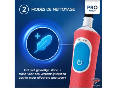 De Oral-B Pro Kids elektrische tandenborstel, aanbevolen door tandartsen voor kinderen vanaf 3 jaar, biedt een milde, effectieve reiniging. Met 2 borstelstanden, waaronder een unieke, kindvriendelijke gevoelige stand reinigt deze borstel de tanden van kinderen voorzichtig. Hij verwijdert meer tandplak dan een gewone manuele tandenborstel. Er zitten 4 themastickers bij om het handvat mooier te maken.