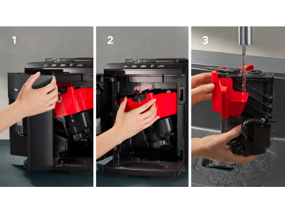 De lekbak voor spoelwater en uitklopbak voor koffiepucks is te bereiken via de voorzijde van het apparaat. De zetgroep is via deze servicedeur ook uit te nemen en te reinigen.