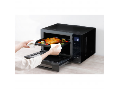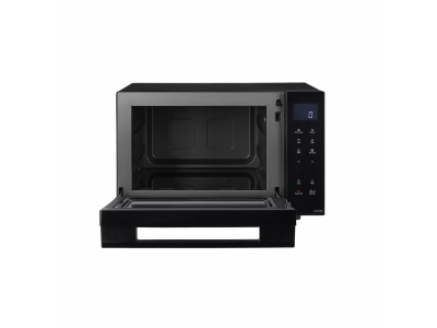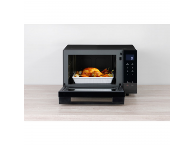 Perfect voor kleinere keukens met weinig ruimte op het aanrecht: de NN-DF37 is uiterst compact van formaat en biedt toch een grote kookruimte waar zelfs een hele kip in past. Door de geringe breedte komt er aan de voorkant ruimte vrij op het aanrecht om kleine dingen te regelen, terwijl de uittrekbare deur je meer flexibiliteit geeft bij de opstelling. Omdat hij geen draaiplateau heeft, gebruik je de meegeleverde geëmailleerde bakplaat of zelfs rechthoekig kookgerei.