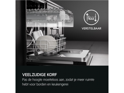 Zelfs als de bovenkorf geladen is, kan je het niveau van de bovenkorf van jouw vaatwasser eenvoudig aanpassen aan de vaat in de bovenste of onderste korf.