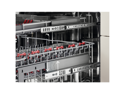 Zelfs als de bovenkorf geladen is, kan je het niveau van de bovenkorf van jouw vaatwasser eenvoudig aanpassen aan de vaat in de bovenste of onderste korf.