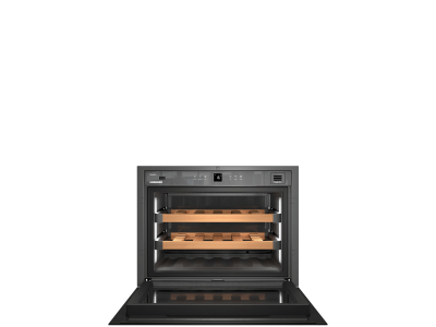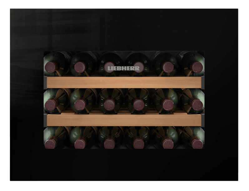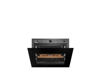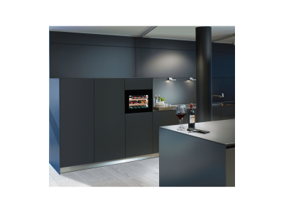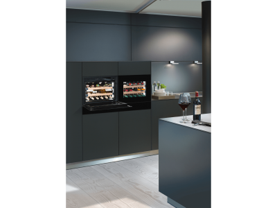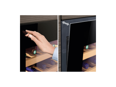Compacte inbouw wijnkoelkast met zwarte greeploze glasdeur en verticale TipOpen techniek. Temperatuur digitaal instelbaar vanaf +5°C tot +20°C. De houten plateaus lopen op metalen telescooprails en de 2 LED lichtzuilen kunt u met stapjes dimmen en permanent laten branden. Capaciteit 18 flessen Bordeauxformaat, langere rosé of witte wijnflessen kunnen veilig in de breedte worden gelegd.