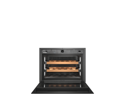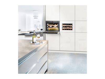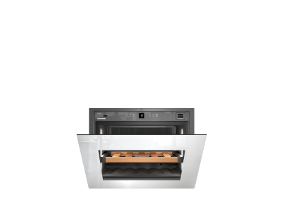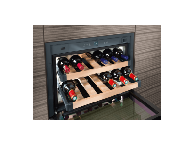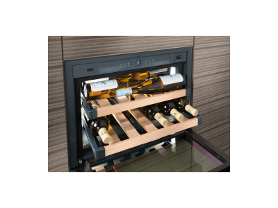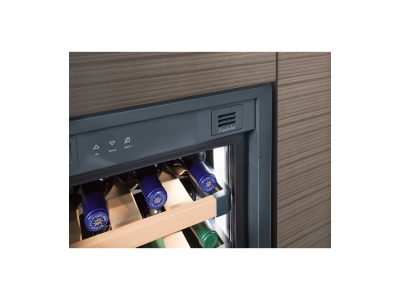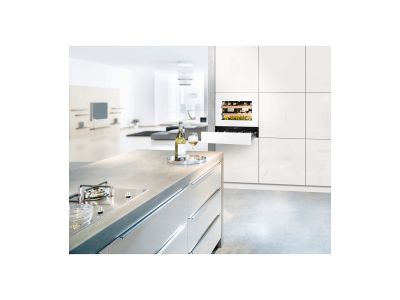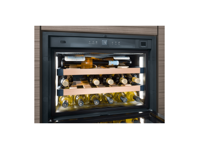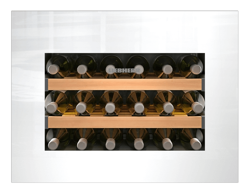 Compacte inbouw wijnkoelkast met witte greeploze glasdeur en verticale TipOpen techniek. Temperatuur digitaal instelbaar vanaf +5°C tot +20°C. De houten plateaus lopen op metalen telescooprails en de 2 LED lichtzuilen kunt u met stapjes dimmen en permanent laten branden. Capaciteit Bordeauxformaat 18 flessen, langere rosé of witte wijnflessen kunnen veilig in de breedte worden gelegd.