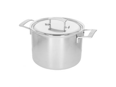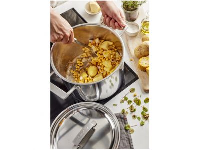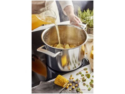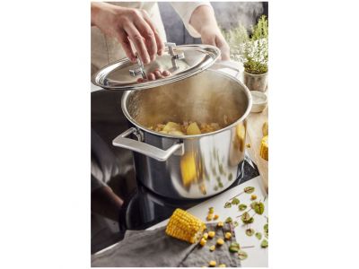 Of je nu een authentieke minestrone, een oosterse pompoencurrysoep of een klassieke aspergevelouté wil maken, met de Industry 5 soeppot (24 cm) is het aangenaam en handig werken. Ideaal op gas, doordat de wanden van de soeppot de restwarmte van de gasvlam ook mee opnemen, maar evenzeer bijzonder geschikt voor alle andere kookplaten, ook inductie, en de oven. Het solide 5-lagenmateriaal tot aan de rand verzekert je van een goede verdeling van de warmte en temperatuurcontrole. Deze soeppot uit de Industry 5 collectie heeft ook de ideale afmetingen om de ingrediënten voor een zomerse koude soep in te mixen: gazpacho met tomaat, paprika, ui en look of met komkommer, gepelde amandelen, verse dille en look. Dankzij de speciale gietrand giet je de soep makkelijk en zonder morsen over. De stoere, roestvrijstalen handvatten liggen prima in de hand en blijven lang koel. De grote grepen zijn stevig aan de wand gelast: een hygiënische oplossing want vet, vuil en bacteriën kunnen zich niet nestelen. Het stijlvol vormgegeven deksel past perfect. Hierdoor gaat er geen warmte of stoom verloren en verspil je geen energie. Je Industry 5 soeppot behoudt levenslang zijn originele kleur en glans, dankzij de speciale Silvinox® technologie. Die zorgt er ook voor dat schoonmaken moeiteloos gaat. Deze slimme en robuuste vormgeving in industriële stijl, door de Belgische designer Stefan Schöning, blijft je voldoening geven.