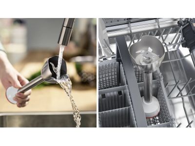 Probleemloos schoonmaken hoeft maar een paar seconden te duren. Als je klaar bent met blenden, laat je de mengvoet met één simpele klik los. Nu kun je hem snel en gemakkelijk schoonmaken onder stromend water of in de vaatwasmachine.